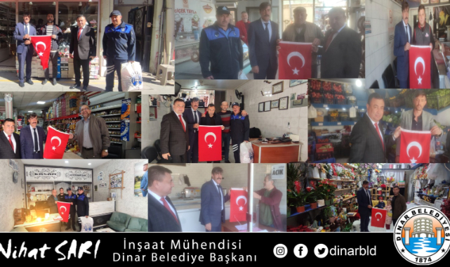 Türk Milleti olarak, en büyük değerlerimizden bir tanesinin milli ve dini bayramlarımız olduğuna değinen Belediye Başkanımız Nihat Sarı, “Cumhuriyet Bayramımız tarih sayfalarına altın harflerle yazılan ve ulusumuzun kaderinin değiştiği bir kahramanlık destanının tacıdır. Cumhuriyetimizin 99. yılına denk gelen bugün de Dinar Belediyesi olarak cumhuriyetimizi coşku ile kutlayarak, birliğimizin ve bağımsızlığımızın sembolü ay yıldızlı bayrağımızı esnaflarımıza takdim ettik. Gururla göğsümüzde taşıdığımız bayrağımızın Dinarımızın her köşesinde, her esnafımızın iş yerinde gururla dalgalanıyor olması da bizlere gurur veriyor. Bizlere bu bayramı yaşamamıza vesile olan başta Ülkemizin kurucusu Gazi Mustafa Kemal Atatürk’e, silah arkadaşlarına, tüm şehit ve gazilerimize şükran ve minnetlerimi sunuyor, tüm hemşerilerimin 29 Ekim Cumhuriyet Bayramını kutluyorum ”dedi.