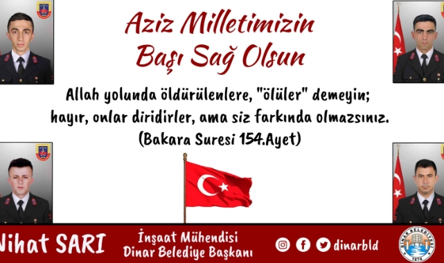 Dinar Belediye Başkanımız Nihat Sarı Şehitlerimiz için bir başsağlığı mesajı yayımladı.