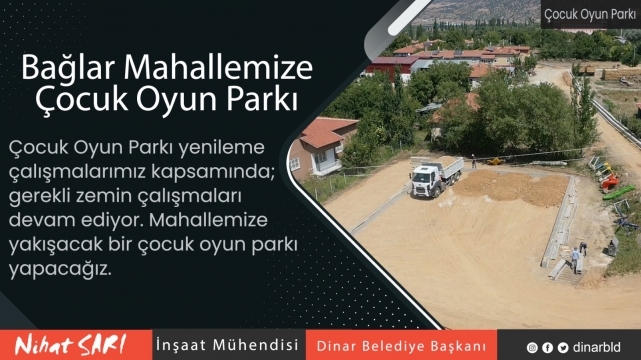 Dinar Belediye Başkanımız Nihat Sarı’nın talimatları doğrultusunda ilçemiz genelinde devam eden çocuk oyun parkı yenileme ve yeni çocuk oyun parkı yapma çalışmaları kapsamında ilçemiz Bağlar Mahallesinde mevcut durumda bulunan çocuk oyun parkında yenileme çalışmaları gerçekleştiriliyor.