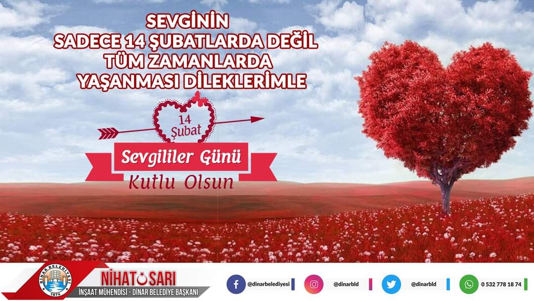 Dinar Belediye Başkanımız Nihat Sarı 14 Şubat Sevgililer Günü dolayısıyla bir mesaj yayımladı.