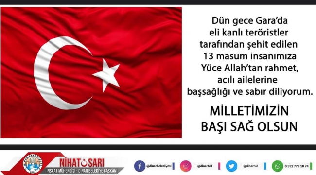 Dinar Belediye Başkanımız Nihat Sarı mesajında; “Dün gece Irak'ın kuzeyi Gara’da bir mağarada esir tutulan 13 masum vatandaşımız eli kanlı teröristler tarafından şehit edildi. Şehit edilen vatandaşlarımıza Yüce Allah’tan rahmet acılı ailelerine başsağlığı ve sabırlar diliyorum. Milletimizin başı sağ olsun. “Ifadelerini kullandı.