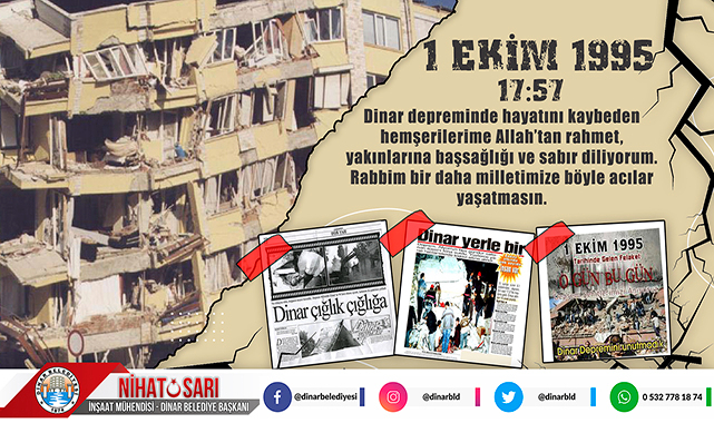dönümü nedeniyle bir mesaj yayımladı.Dinar Depreminin hala acısının ilk günkü gibi hissedildiğini ifade eden BelediyeBaşkanımız Nihat Sarı; “1 Ekim 1995 tarihinde saat 17.57’ de ilçemizde hepimizi derinden sarsan, Richter ölçeğine göre 6 şiddetindeki depremde maalesef 94 insanımız yaşamını yitirdi. 250 civarında hemşerimiz yaralanmıştı, yaklaşık2158’e yakın bina hasar gördü ve yıkıldı. 1 Ekim 1995 Tarihinde ilçemizde yaşanılan deprem ne ilk ne de sondur. 1995 yılında yaşadığımız bu acı depremi de hiçbir zaman unutmayacağız. Rabbim bir daha ilçemize ve milletimize böyleacılar yaşatmasın. Kurumlarımızın ve sivil toplumun gayretleriyle insanlarımızın bilinçlendirilmesi ve ilçemizde ki tüm bina stokunun depreme dayanıklı hale getirilmesi, hepimize düşen hayati bir görevdir. Belediye olarak deprem için alınması gereken önlemleri alıyoruz.Hiçbir zaman unutmayacağımız ve bu