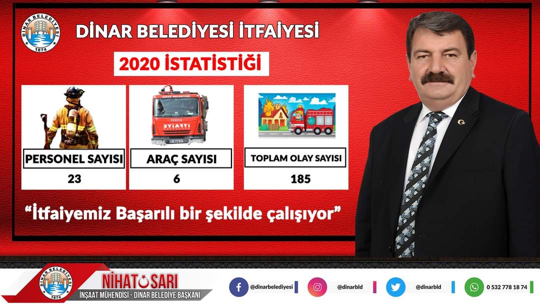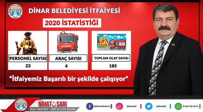 Belediye Başkanımız Nihat Sarı açıklamasında; “Vatandaşın can ve mal güvenliğini korumak için mesai saati gözetmeksizin görev yapan Dinar Belediyesi İtfaiye Müdürlüğü yoğun bir yılı geride bıraktı. Ekiplerimiz, 2020 yılında 185 olaya anında müdahale ederek, büyük bir başarıya imza attı.