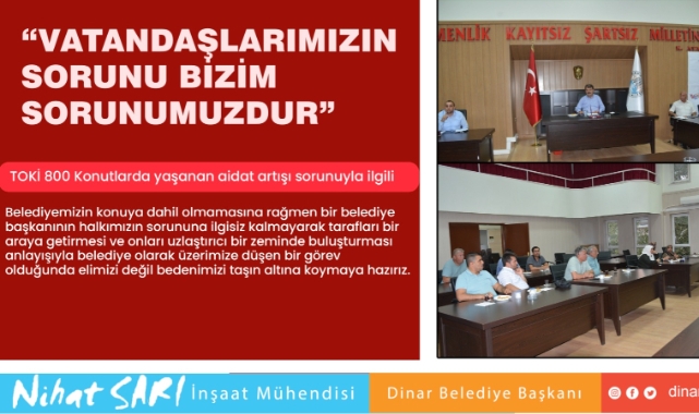 Dinarımızın ve vatandaşlarımızın sorunu bizim sorunumuzdur anlayışıyla Dinar Belediye Başkanımız Nihat Sarı, AK Parti İlçe Başkanımız İdris Er ve MHP İlçe Başkanımız Mustafa Karahan ile birlikte TOKİ 800 Konutlarda yaşanan aidat artışı ile ilgili TOKİ Emlak Yönetim Bölge Müdürü Sinan Türkmen’in ve TOKİ 800 konut halkını temsilen vatandaşlarımızın katılımıyla Dinar Belediye Meclis Salonumuzda acil bir toplantı gerçekleştirdi.