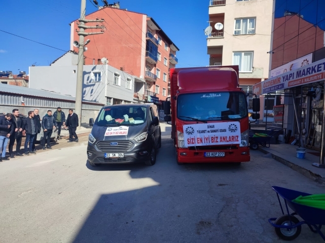 Dinar Ticaret ve Sanayi Odası Yönetim ve Meclis Kurulu ile üyelerden deprem bölgesine Yardım için odaya gönderilen erzak, battaniye, hijyen malzemesi gibi ürünler, edilen duanın ardından Yönetim Kurulunun kendi araçları ile deprem bölgesine teslim edilmek üzere yola çıktı.Dinar Ticaret ve Sanayi Odası Yönetim Kurulu Başkanı Veli Özcan ''Bu süreçte bizleri yalnız bırakmayan üyelerimize ve ilçe halkımıza teşekkür ederiz.1995 yılında depremi yaşamış bir ilçe olarak depremzede vatandaşlarımızı en iyi bizler anlarız, Ülkemizin birdaha bu tür afetler yaşamamasını diliyoruz, her zaman birlik içinde milletimizin yanındayız'' diye konuştu.