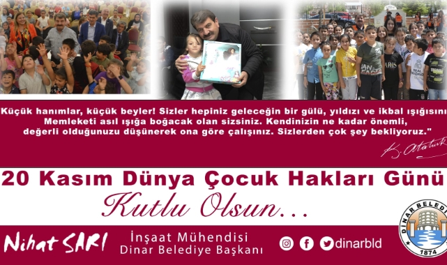 Dinar Belediye Başkanımız Nihat Sarı, 20 Kasım Dünya Çocuk Hakları Günü dolayısıyla bir kutlama mesajı yayımladı.