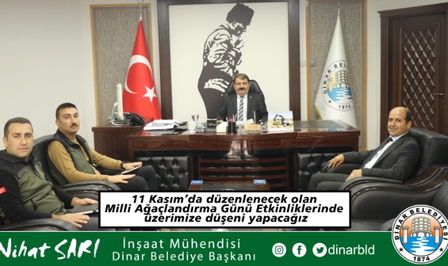 Ziyarette; İlçemizde belediye olarak yeşil alanların arttırılması adına gerekli çalışmaları yaptıklarını ifade eden Dinar Belediye Başkanımız Nihat Sarı, “İlçemizi güzelleştirmek adına “Yeşili Sev, Doğayı Koru” anlayışıyla mevsim koşullarımıza uygun ağaçların dikimi belediyemiz tarafından yapılıyor. Cumhurbaşkanımız Sayın Recep Tayyip Erdoğan’ın tensipleriyle ülkemiz genelinde her yıl 11 Kasım saat 11.11’de ağaç dikme etkinliği gerçekleşiyor. Bizlerde ilçemizde bu yıl düzenlenecek olan etkinlikte belediye olarak üzerimize düşeni yapacağız. Nazik davetleri dolayısıyla Orman İşletme Müdürümüze teşekkür ediyorum.” dedi