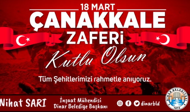 Dinar Belediye Başkanımız Nihat Sarı, 18 Mart Çanakkale Deniz Zaferi ve Şehitleri Anma günü dolayısıyla bir mesaj yayımladı.18 Mart 1915 yılında kazandığımız Çanakkale Deniz Zaferimizin bütün dünyayı hayrete düşüren emsalsiz bir destan olduğunu belirten Dinar Belediye Başkanımız Nihat Sarı mesajında; “Çanakkale Deniz Zaferi; Türk Tarihi’nde bir askeri ve siyasi başarı olmaktan öte; inanç, azim ve cesaretle gerçekleşmiş bir destanın adıdır. Kahraman Ordumuzun “Çanakkale Geçilmez” nidalarıyla kazandığı Çanakkale Zaferi’nde; yaralı düşmanı hastaneye sırtında götüren, vurduğu düşman gemisinden denize düşen askerlerin kurtulabilmesi için top ateşini kesen Mehmetçik, Türk Ordusu’nun savaşta dahi insanlığını unutmadığını göstererek yalnız Gelibolu ‘da değil tüm dünya gönlünde de abideleşmiştir. Bugün bizlere düşen görev, şehitlerimizin kanlarıyla sulanan ve bizlere emanet edilen bu kutsal toprakları, aynı şuurla sahip çıkarak korumak ve bizden sonraki nesillere daha güvenli bir şekilde devretmektir. Şühedanın bizlere bıraktığı vatan topraklarını ve onların emanetine sahip çıkmak için milli ve dini değerlere sahip, iyi yetişmiş çocuklarımız ve gençlerimizle Aziz Milletimiz, teknolojide ve bilimde de destanlar yazmaya devam edecektir.
