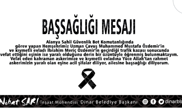 Dinar Belediye Başkanımız Nihat Sarı, Alanya Sahil Güvenlik Bot Komutanlığında görev yapan hemşehrimiz Uzman Çavuş Muammed Mustafa Özdemir'in vefatı dolayısıyla bir başsağlığı mesajı yayımladı. Belediye Başkanımız Nihat Sarı yayımladığı başsağlığı mesajında; "Alanya'da görev yapan Hemşehrimiz Uzman Çavuş Muhammed Mustafa Özdemir'in ve kıymetli evladı İbrahim Meriç Özdemir'in geçirdiği trafik kazası sonucunda vefat ettiğini eşinin ise yaralı olduğunu derin bir üzüntüyle öğrenmiş bulunmaktayım. Vefat eden kahraman askerimize ve kıymetli evladına Yüce Allah’tan rahmet askerimizin yaralı olan eşine acil şifalar diliyor, ailesine başsağlığı diliyorum. " dedi