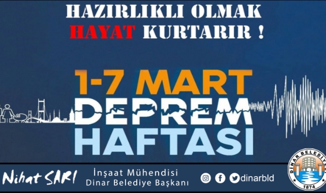 Dinar Belediye Başkanımız Nihat Sarı 1-7 Mart Deprem Haftası olması dolayısıyla bir mesaj yayımladı.Dinar Belediye Başkanımız Nihat Sarı, depreme karşı tedbirlerin alınması, halka depremden korunma yollarının anlatılması ve afetlere hazırlık konusunda kamuoyunda bilinç oluşturulması amacıyla her yıl 1-7 Mart tarihlerinde Deprem Haftası etkinlikleri yapıldığına değinerek “Aktif fay hatları üzerinde bulunan ülkemiz, deprem gerçeği ile karşı karşıyadır. Ülkemizde geçtiğimiz günlerde meydana gelen üzücü depremler can ve mal kayıplarına neden olmuştur. Deprem ve diğer afetlerin sebep olacağı zararların azaltılabilmesi konusunda devletimize, kamu kurumlarımıza, sivil toplum kuruluşlarımıza ve vatandaşlarımıza önemli görevler düşüyor.