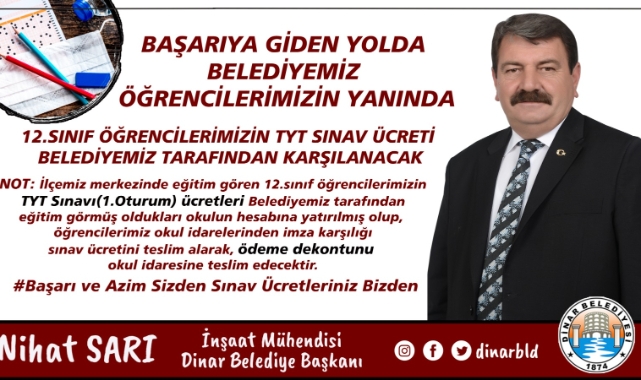 Öğrencilerimiz 1. Oturum sınav ücretlerini eğitim görmüş oldukları okuldan imza karşılığı alarak, ödeme dekontunu okul idaresine teslim edecek. Daha önce sınav ücreti ödemiş olan öğrencilerimiz ise ödeme dekontu ile okula başvuru yaparak imza karşılığı sınav ücretini alabilecek. Azim ve çalışma sizden sınav ücretleriniz bizden sloganı ile öğrencilerimize verdikleri desteklere bir yenisini daha eklediklerini ifade eden Dinar Belediye Başkanımız Nihat Sarı, Üniversite sınavına girecek olan öğrencilerimizin üzerinden maddi yükümlülüğü hafifletmek adına sınav ücretlerini karşıladıklarını belirterek, eğitime göreve geldikleri günden bugüne büyük destekler verdiklerini, bunun yanı sıra öğrencilerimizi de yormamak adına sınav ücretlerini okulların hesaplarına aktardıklarını açıklayarak sınava girecek öğrencilerimize başarılar diledi.