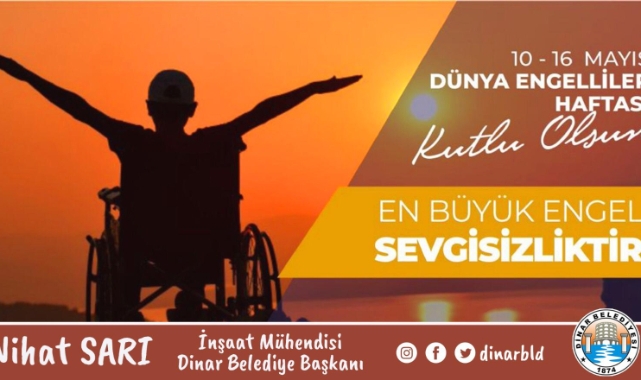 Dinar Belediye Başkanımız Nihat Sarı, Engelliler Haftası dolayısıyla bir mesaj yayımladı.Engelli bireylerin fırsat verildiğinde birçok başarıya imza atabileceklerini ifade eden Dinar Belediye Başkanımız Nihat Sarı, “Engelliler Haftası, engelli vatandaşlarımızın yaşamlarını kolaylaştırmak ve onları toplumsal hayatta daha etkin ve verimli kılmak adına her yıl 10-16 Mayıs tarihleri arasında kutlanan önemli bir farkındalık haftasıdır. Engelli olmak kişinin tercihi değildir, bu sebeple birer engelli adayı olduğumuzu hatırlayarak engelli vatandaşlarımıza karşı her zaman düşünceli ve duyarlı olmalıyız. Sanattan spora, edebiyattan siyasete, eğitimden çalışma hayatına kısacası her alanda önemli başarılara imza atan engelli kardeşlerimizin verdikleri mücadele gerçekten takdire şayandır. Engelli vatandaşlarımızın ihtiyaç ve taleplerini karşılamak ve onların günlük yaşam içinde rahatlıkla yerlerini alabilecek şartları oluşturmak bizlere düşen en büyük görevdir. Gerek Hükümetimiz gerekse Belediyemiz yaptığı çalışmalarla engellilerin yüzünü güldürmeye devam ediyor. Bizlerde ilçemizi engelsiz bir şehir haline getirmek için tüm ekibimizle birlikte var gücümüzle çalışıyor ve engelleri hep birlikte aşıyoruz.
