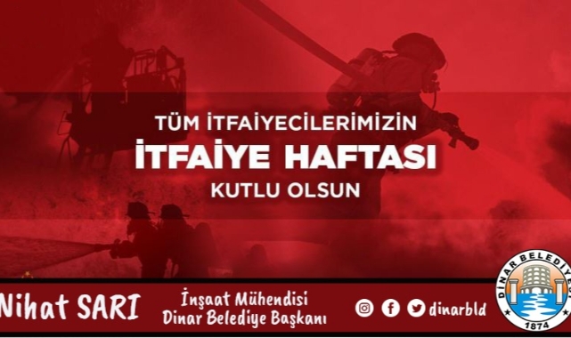 Dinar Belediye Başkanımız Nihat Sarı 25 Eylül- 1 Ekim tarihleri arasında kutlanan İtfaiye Haftası dolayısıyla bir mesaj yayımladı.Hayatın içinde maddi ve manevi sorumluluğu çok büyük olan görevlerden birisinin hiç kuşkusuz itfaiyecilik mesleği olduğuna değinen Belediye Başkanımız Nihat Sarı yayımladığı mesajında; “Muhtelif yangın ve kazalarda can ve mal kaybını korumaya yönelik görev yapan itfaiyecilerimiz, diğer yandan da kendi canlarını riske atmaktadır. İtfaiyecilerimiz insanın hayatını etkilediği kadar, doğadaki diğer canlıların da yaşama sebebi olabilmektedir. Onlar, kimi zaman araçlarımızın kaputlarında, kimi zaman apartman çatılarında, kimi zaman ağaç tepelerinde, kimi zamansa orman yangınlarından zarar görmemek için umutla ama çaresizce yardım bekleyen canlıların ve can dostlarımızın da kahramanlarıdır.