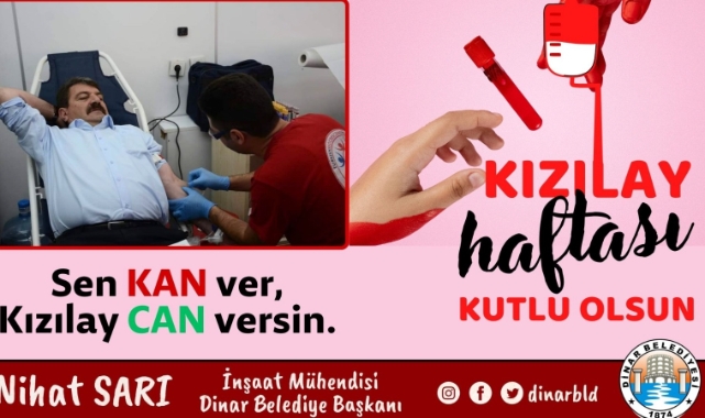 Dinar Belediye Başkanımız Nihat Sarı 29 Ekim-4 Kasım tarihlerinde kutlanan Kızılay Haftası dolayısıyla bir mesaj yayımladı. Belediye Başkanımız Nihat Sarı yayımladığı mesajında; “Sen Kan Ver Kızılay Can Versin” sloganıyla Milletimizin yardımseverlik ruhunun bir yansıması olarak, 1 buçuk asırdan fazla bir zamandır, Türkiye’de ve dünyanın her yerinde ihtiyaç sahiplerine yardım elini uzatan Türk Kızılay’ımızın yöneticilerinin ve tüm Kızılay Gönüllerimizin haftasını kutluyorum."ifadelerini kullandı.