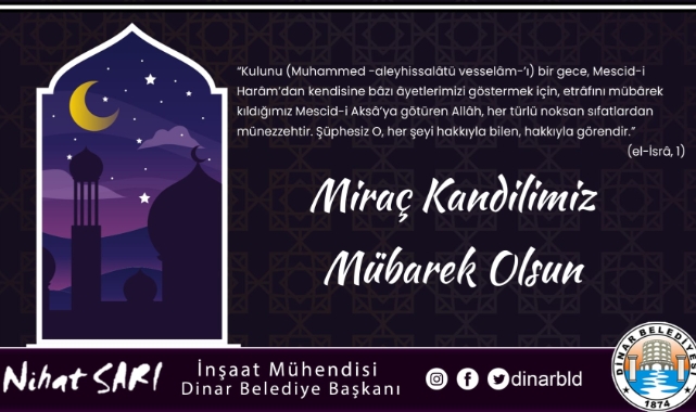 Dinar Belediye Başkanımız Nihat Sarı, miraç kandili dolayısıyla bir mesaj yayımlayarak tüm İslam Alemi’nin Miraç Kandili’ni tebrik etti.