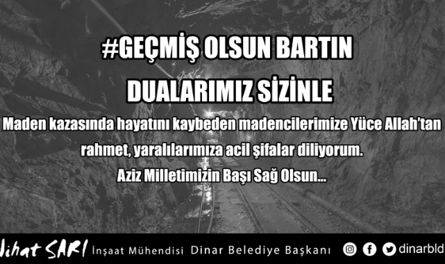 Dinar Belediye Başkanımız Nihat Sarı, Bartın'ın Amasra ilçesinde meydana gelen maden ocağı patlaması dolayısıyla bir başsağlığı mesajı yayımladı.