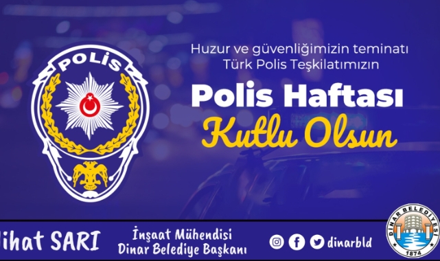 Dinar Belediye Başkanımız Nihat Sarı, Türk Polis Teşkilatımızın Kuruluşunun 178. Yılı dolayısıyla bir mesaj yayımladı.Aziz Türk Milletimizin her zaman kahraman polis teşkilatımıza güveninin sonsuz olduğuna değinen Dinar Belediye Başkanımız Nihat Sarı mesajında; “Vatan topraklarımızın dört bir tarafında büyük bir özveri ve fedakarlıkla çalışan, milletimizin huzuru ve güvenliği için görevini en iyi şekilde yapma anlayışıyla Türk Polis Teşkilatımızın 178. kuruluş yıl dönümünü ve içinde bulunduğumuz Polis Haftası'nı kutluyorum.