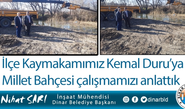 Dinar Belediye Başkanımız Nihat Sarı, İlçe Kaymakamımız Kemal Duru ile birlikte İlçemiz Düden mevkisinde devam eden Millet Bahçesi Projesi çalışmalarını yerinde inceledi. Dinar Belediye Başkanımız Nihat Sarı, İlçe Kaymakamımız Kemal Duru ile çalışmaları yerinde inceleyerek, Kaymakam Duru’ya projemiz hakkında bilgi vererek, projemiz hayata geçtiğinde vatandaşlarımızın aileleri ile güzel zamanlar geçireceği sosyal bir alanın daha ilçemize kazandırılmış olacağını belirtti.