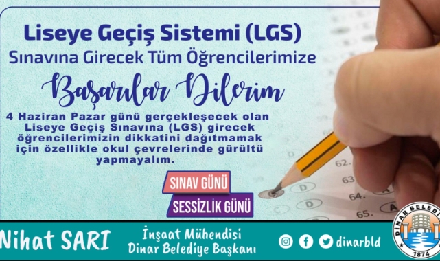 Dinar Belediye Başkanımız Nihat Sarı, 4 Haziran'da yapılacak Liseye Geçiş Sınavı (LGS) sınavı dolayısıyla bir mesaj yayımladı.Belediye Başkanımız Nihat Sarı yayımladığı mesajında; “Geleceğimizin istikbali ve teminatı olan kıymetli evlatlarımız uzun zamandır emek harcayıp, çalıştıkları önemli bir sınava girecekler. 8 yıl süren bir eğitim-öğretim sürecinin ardından hayal ettikleri geleceğe ulaşmanın ilk adımı olan bu Sınav çocuklarımızın geleceği açısından çok önemlidir.Bu sınav hiçbir şeyin sonu değildir. Sınav başarısının hayat başarısı olmadığını bilmek gerekir. Başarı ya da başarısızlığı her şeyin başlangıcı ya da sonu olarak görmemeli, öğrencilerimize bu konuda sonuna kadar destek olunmalıdır.Bu duygu ve düşüncelerle, LGS sınavına girecek tüm öğrencilerimize başarılar diliyor, Öğrencilerimizin topluma faydalı bireyler olması için bin bir fedakârlıkla emek veren öğretmenlerimize ve onları yetiştiren velilerimize teşekkür ediyorum” dedi.