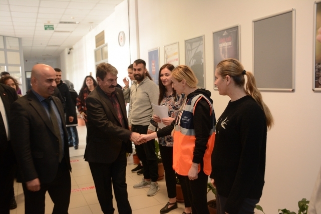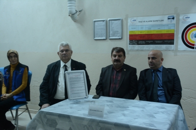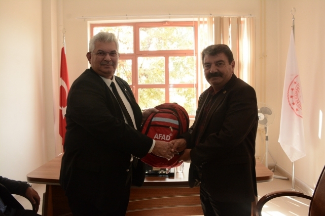 Tatbikat programı öncesinde Afet Yönetim Merkezi Afyonkarahisar Şube Müdürü Orhan Meydanoğlu, Dinar Belediye Başkanımız Nihat Sarı’ya AFAD İlk Yardım çantasını takdim etti.