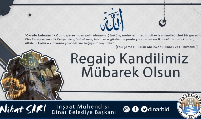 Dinar Belediye Başkanımız Nihat Sarı, Regaip Kandili dolayısıyla bir kutlama mesajı yayımladı.