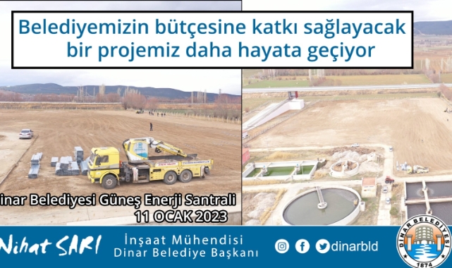 Dinar Belediye Başkanımız Nihat Sarı, göreve geldiği günden bugüne ilçemizde hayata geçirdiği büyük projelere bir yenisini daha ekliyor. Belediyemiz Arıtma Tesisi’nin yanındaki alana kurulumu bugün itibariyle başlayan Güneş Enerji panelleriyle belediyemiz kendi elektrik enerjisini üreterek elektrik tasarrufu noktasında da önemli bir katkı sağlayacak.