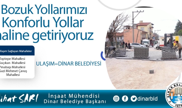 Dinar Belediye Başkanımız Nihat Sarı, göreve geldiği günden bugüne ulaşıma büyük önem veriyor. İlçemiz genelinde doğalgaz çalışması olan yollarımız başta olmak üzere, şiddetli yağışlar dolayısıyla zamanla bozulan ve bakım ihtiyaç duyulan yollarımızda gerekli bakım, onarım ve yenileme çalışmalarımız devam ediyor.