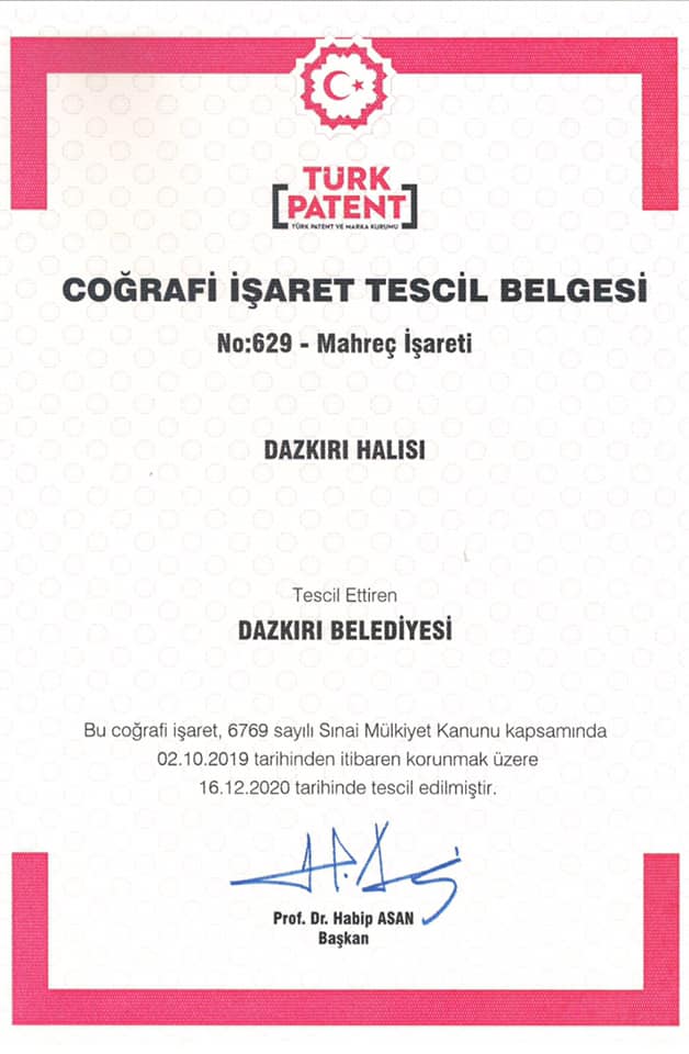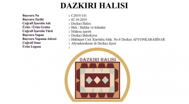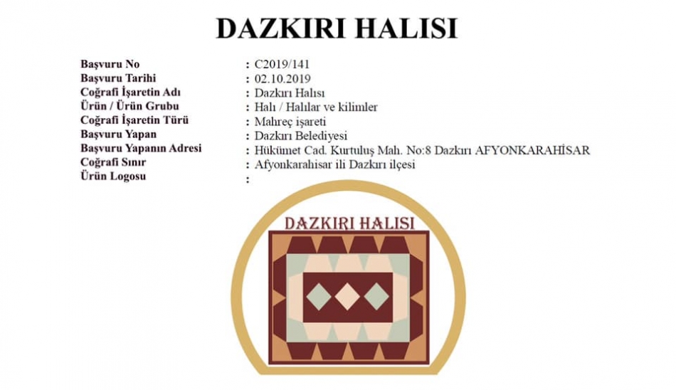 Yaklaşık 3 yıldır büyük uğraşlar verdiğimiz; Dazkırımızın kültürel varlığı, geçmişte kadınlarımızın ilmek ilmek dokuyup çocuklarını okuttuğu, genç kızlarımızın çeyizini hazırladığı ve ilçemizden bütün dünyaya ihraç edilen meşhur “Dazkırı Halısı” belediyemizin adına belediyemiz emekçileri sayesinde Türk Patent ve Marka Kurumu tarafından tescillenmiştir. Belediye Başkanımız İsmail TAYLAN; “Üstün gayretlerinden dolayı belediyemiz emekçilerine teşekkür ediyor, Dazkırımıza ve bütün hemşehrilerime hayırlı olmasını diliyorum” dedi.
