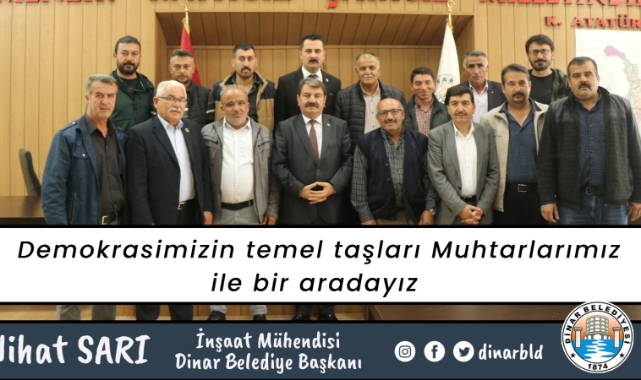 İlgili birim amirlerimizin de hazır bulunduğu toplantıda; Dinar Merkez Mahalle Muhtarları Derneği Başkanı Mehmet Gürpınar ve mahalle muhtarlarımız Dinar Belediye Başkanımız Nihat Sarı’ya mahallelerimize yapılan hizmetler dolayısıyla teşekkür ederek, talep ve isteklerini ilettiler.“MUHTARLARIMIZ İLE HER ZAMAN İLETİŞİM HALİNDEYİZ”