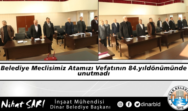 Dinar Belediye Başkanımız Nihat Sarı ve Belediye meclis üyelerimizin katılımıyla gerçekleşen Kasım Ayı Olağan Meclis toplantısı öncesinde Ülkemizin kurucusu Gazi Mustafa Kemal Atatürk’ün vefatının 84.yıldönümü dolayısıyla bir dakikalık saygı duruşunda bulunularak, akabinde İstiklal Marşımız okundu.