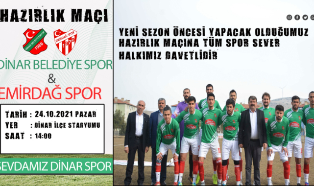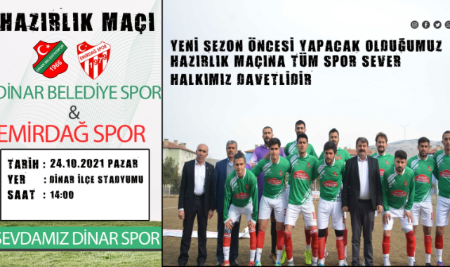 Süper Amatör Liginde oynayan Dinar Belediye Sporumuz 2021-2022 Sezonu öncesi Emirdağ Spor ile oynayacağı maça tüm spor sever halkımız davetlidir.
