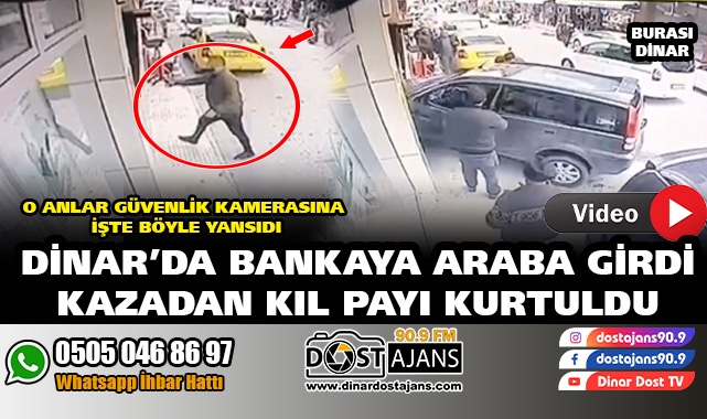 Dinar'da bugün bir otomobil henüz bilinmeyen bir sebepten dolayı direksiyon hakimiyetini kaybederek bir bankaya girdi o anlarda ise bir vatandaş ezilmekten son anda kurtuldu. Bugün dinar merkezde gerçekleşen kaza güvenlik kameralarına saniye saniye yansıdı. Otomobil direksiyon hakimiyetini kaybederek bankanın kapısına çarparak durabildi. Çarpmadan sadece birkaç saniye önce ise bir müşteri bankadan içeri girdi ve kazadan saniyelerle yara almadan kurtuldu. Olayda kimse yara almazken bankada ve otomobilde maddi hasar meydana geldi. Dinar Dost Ajans Güvenlik kamerası görüntülerine sizler için ulaştı.DinarDostAjans90.9 - Oğuzhan UYSAL