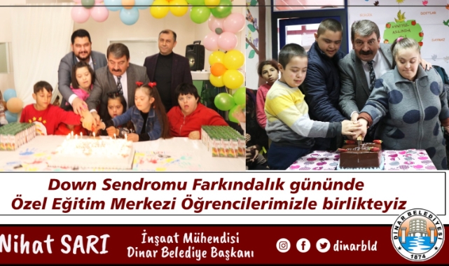 Dinar Belediye Başkanımız Nihat Sarı, 21 Mart Down Sendromu Farkındalık Günü dolayısıyla ilçemizde faaliyet gösteren Dinar Öncü İletişim Özel Eğitim ve Rehabilitasyon Merkezi ile Dinar Yeni Renk Özel Eğitim ve Rehabilitasyon Merkezinde eğitim gören öğrencilerimiz ile bir araya geldi. Ziyaretlerinde; İlk önce okul idarecileri ile eğitim faaliyetleri hakkında görüşen Belediye Başkanımız Nihat Sarı, Down Sendromunun bir hastalık değil bir farkındalık olduğuna değinerek, okullarda eğitim gören öğrencilerimiz ile bir süre sohbet etti.