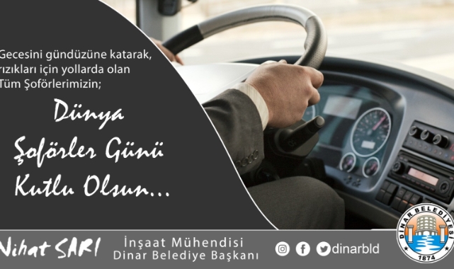 Dinar Belediye Başkanımız Nihat Sarı mesajında; “Öncelikle tüm şoför esnaflarımızın Dünya Şoförler Günü’nü kutluyor, kazasız, belasız, hayırlı yolculuklar diliyorum. Gece gündüz demeden, bileğinin hakkıyla, helalden şaşmadan, bazen ailelerinden ayrı kalarak bazen yoğun trafikle boğuşarak evine ekmek götüren emekçi şoförlerimize Rabbimden kolaylıklar diliyorum.