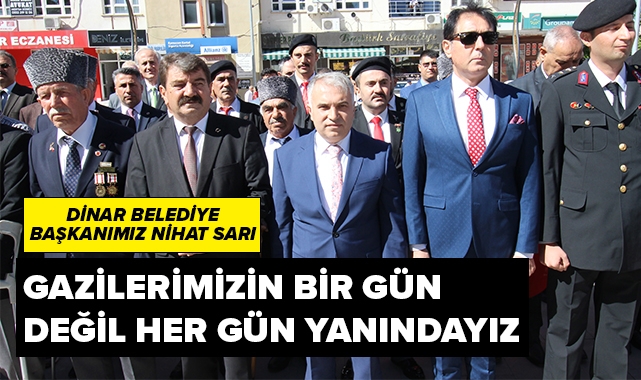 Dinar Belediye Başkanımız Nihat Sarı, ilçemizde 19 Eylül gaziler günü dolayısıyla düzenlenen programlarda şehit ailelerimiz ve gazilerimiz ile bir araya geldi. Belediyemiz hizmet binası önünden İlçe Kaymakamımız Kemal Duru, Dinar Belediye Başkanımız Nihat Sarı ve beraberindeki heyet, gazilerimiz ile şehit ailelerimizin katılımıyla belediye bandomuz eşliğinde törenin gerçekleşeceği Cumhuriyet Meydanımıza yürüyüş gerçekleştirildi.