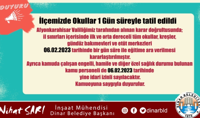 Afyonkarahisar Valiliğimiz tarafından alınan karar doğrultusunda; il sınırları içerisinde ilk ve orta dereceli tüm okullar, kreşler, gündüz bakımevleri ve etüt merkezleri 06.02.2023 tarihinde bir gün süre ile eğitime ara verilmesi kararlaştırılmıştır.Ayrıca kamuda çalışan engelli, hamile ve diğer özel sağlık durumu bulunan kamu personeli de 06.02.2023 tarihinde yine idari izinli sayılacaktır.Kamuoyuna saygıyla duyurulur.