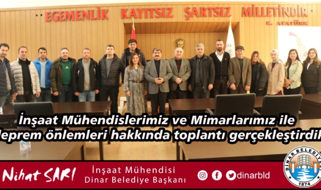 Dinar Belediyesi Meclis salonunda gerçekleşen toplantıda; Dinar Belediye Başkanımız Nihat Sarı, inşaat mühendisleri ve mimarlar ile ilçemizde depreme karşı binalarda ve inşaat yapımlarında alınması gereken önlemler üzerine istişarelerde bulunarak, yapılması gereken çalışmalar üzerinde görüşme gerçekleştirdi.