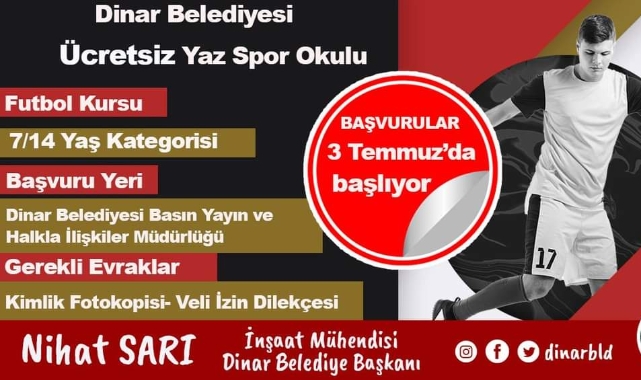 Dinar Belediye Başkanımız Nihat Sarı’nın spora ve sporcuya verdiği destekler devam ediyor. Belediyemizin himayelerinde Dinar Belediye Spor Kulübü iş birliği ile Yaz Spor Okulumuz kapsamında İlçe Stadyumunda Futbol kursu verilecek. 7-14 Yaş kategorisinde futbol kursu almak isteyen çocuklarımız 3 Temmuz Pazartesi gününden itibaren Belediyemiz Basın Yayın ve Halkla İlişkiler Müdürlüğü’ne Kimlik fotokopisi ile birlikte başvuru yapabilecek.