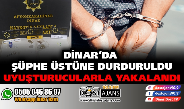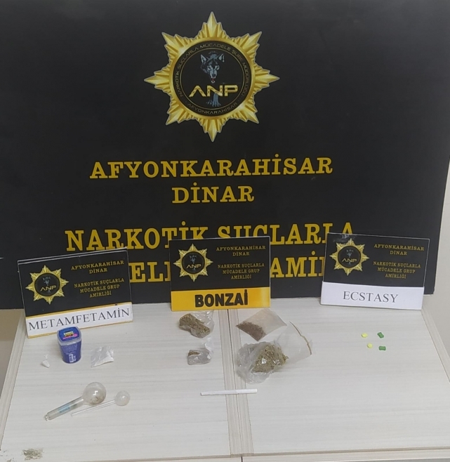 Dinar Narkotik Suçlarla Mücadele Grup Amirliği ekipleri şüphe üzerine durdurdukları bir şahsın üzerinden birçok uyuşturucu madde ele geçirdi. Edinilen bilgiye göre, polis ekipleri tarafından durdurularak üzeri aranan F.C isimli şahıstan 4 parça halinde 26.16 gram sentetik Kannabinoid, 0.79 gr. tütünle karışık sentetik kannabinoid 11.08 gr. Metamfetamin 4 adet Ecstasy ,2 adet kullanma aparatı ele geçirildi. Ele geçen malzemelere polis tarafından el konulurken F.C. isimli şahıs ''Uyuşturucu Madde Ticareti'' kapsamında işlem yapılmak üzere polis tarafından gözaltına alındı. DinarDostAjans90.9 - Oğuzhan UYSAL