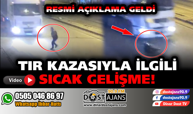 Dün gece saatlerinde Dinar'da meydana gelen bir kişinin yaralandığı trafik kazasından sonra olayla ilgili ilk resmi açıklama geldi.Dinar İlçe Emniyet Müdürlüğü tarafından yapılan resmi açıklama ise şöyle ''Gökhan Ö. isimli şahsın sevk ve idaresindeki 20 NT ... Tır plakalı 02 NG ... Tır Dorse plakalı aracın Yeni Denizli Cad. Total Petrol önü mevkiinde yolun karşısına geçmeye çalışan yaya Süleyman T. isimli şahsa çarpması sonucu meydana geldiği anlaşılmış, Süleyman T. isimli şahıs 112 Acil ambulans vasıtasıyla Dinar Devlet Hastanesine sevk ettirilmiş, burada şahsa Dinar Devlet Hastanesinde yapılan ilk müdahalenin ardından Afyon AFSÜ Hastanesine hayati tehlike kaydıyla sevk edilmiş olup konu günün nöbetçi Cumhuriyet Savcısına aktarılarak alınan talimatlara istinaden tahkikata başlanılmıştır.