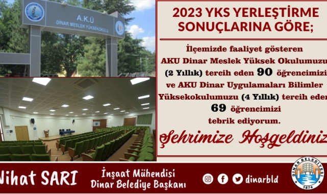 2023 Yüksek Öğretim Kurumları Sınavı (YKS) sonuçlarının ardından yapılan tercih işlemleri sonucunda İlçemizde faaliyet gösteren AKU Dinar Meslek Yüksekokulu’na (2 Yıllık) 90 Öğrencimiz ve AKU Dinar Uygulamalı Bilimler Yüksekokulu’na (4 yıllık) 69 öğrencimiz yerleşti.“BU YIL YİNE ÜCRETSİZ ÖĞRENCİ SERVİSİMİZ DEVAM EDECEK”