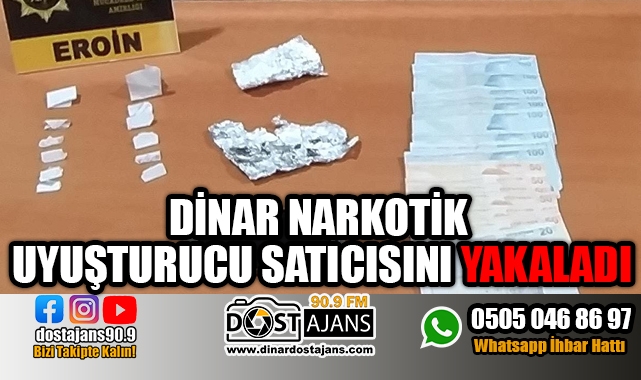 Dinar Narkotik Suçlarla Mücadele Grup Amirliği ve polis Merkezi"> Başmakçı Polis Merkezi Amirliği görevlilerinin uyuşturucu madde kullanımı ve ticaretini önlemeye yönelik yaptığı ortak operasyonda Başmakçı ilçesinde O.K.isimli şahıstan 12 paket/fişek halde 3.86 gram eroin maddesi 2 adet alüminyum folyo 1385 TL para ele geçirildi ele geçen malzemelere polis tarafından el konulurken O.K isimli şahıs hakkında ''Uyuşturucu veya Uyarıcı Madde İmal ve Ticaretinden'' işlem yapılarak gözaltına alındı. O.K'ya Emniyetteki işlemlerinin ardından çıkarıldığı mahkeme tarafından adli kontrol tedbirleri uygulandığı öğrenildi. DinarDostAjans90.9Oğuzhan Uysal